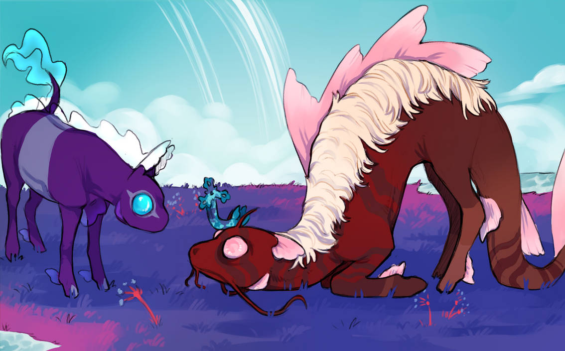 Like most other Confibulan fauna, these creatures use hemocyanin in their blood and have bones made of silica microcrystals. They have a poor oxygen affinity, but their world has a low oxygen content anyways so it ended up being the most efficient oxygen transport pigment. Their innards, thus, are blue. They are trilaterally symmetrical as well as mirrored from front to back. Food can enter through the heads on each end, and exits through cloacas on each side of the body.